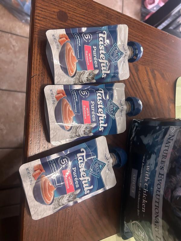 - - Contains one Three oz Resealable Twist Cap Pouch of BLUE Tastefuls Adult Cat Natural Purees