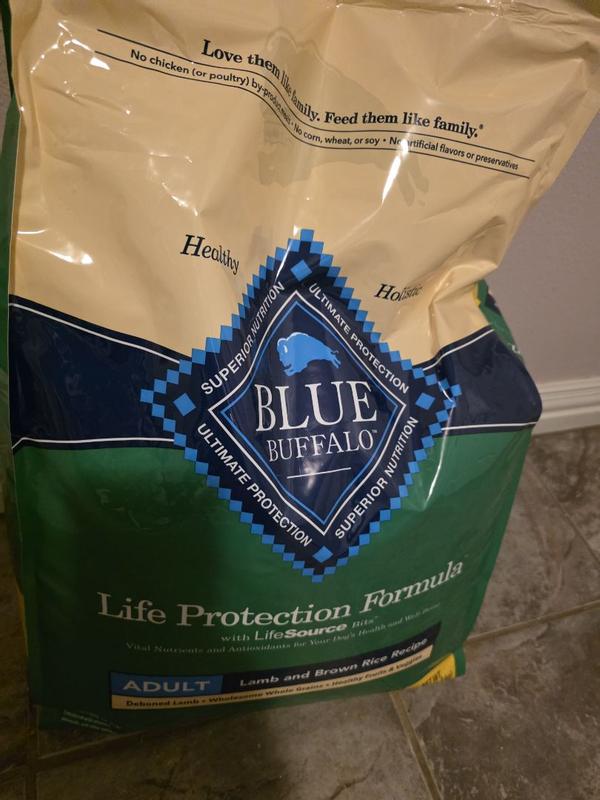 Formulated for the health and well-being of adult dogs, BLUE Life Protection Formula Lamb and Brown Rice dry dog food is made with the finest natural ingredients enhanced with vitamins, minerals, and other nutrients. It's a high-quality, balanced recipe you can both feel great about. Designed to help your dog thrive, this formula starts with real lamb and contains no chicken (or poultry) by-product meals, no corn, wheat, or soy, and no artificial flavors or preservatives. Like all BLUE dry foods, BLUE Life Protection Formula includes exclusive, antioxidant-rich LifeSource Bits to support a healthy immune system in your adult dog. Give your dog the balanced nutrition of BLUE Life Protection Formula today. BLUE Life Protection Formula is brought to you by Blue Buffalo, the leader in natural pet food. Blue Buffalo makes premium-quality pet foods featuring real meat, fruit, and vegetables. Love them like family. Feed them like family.
