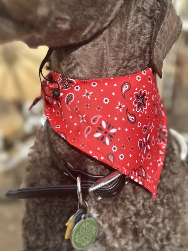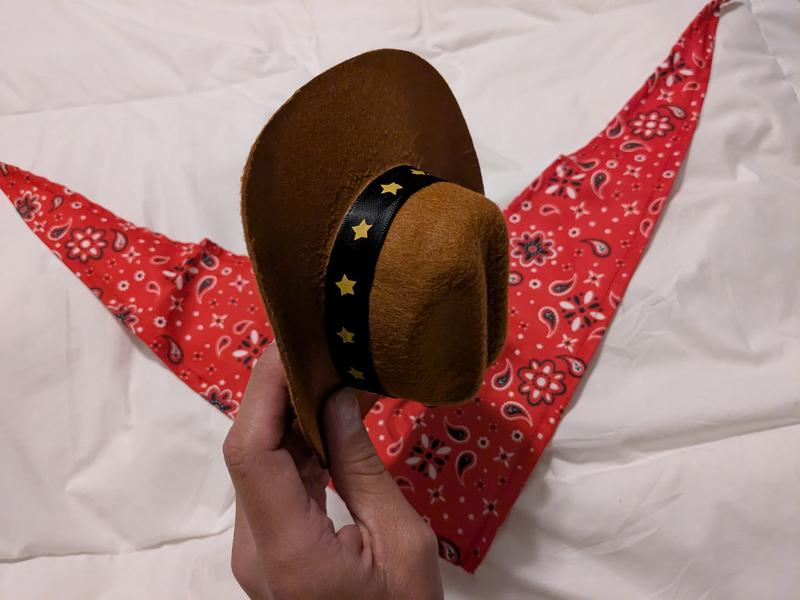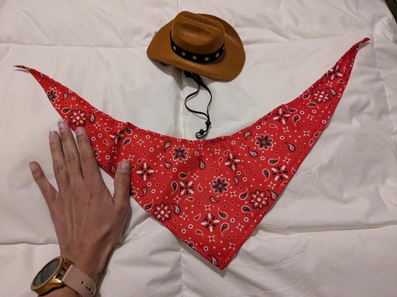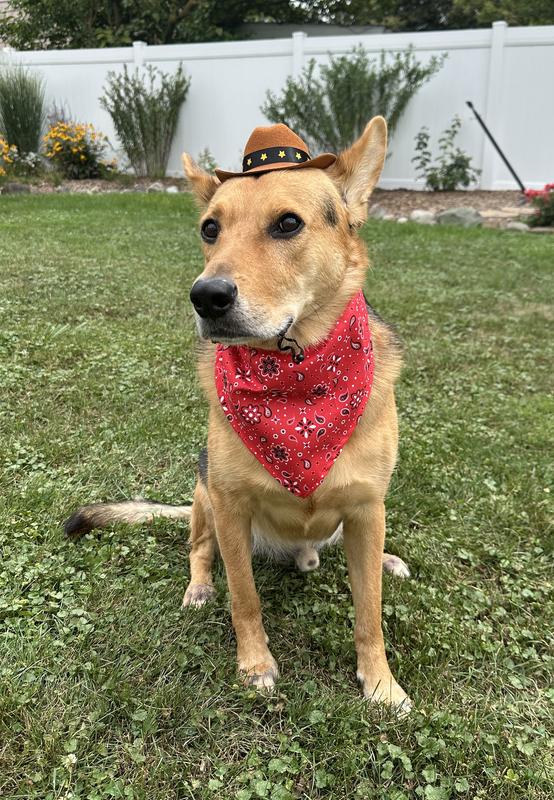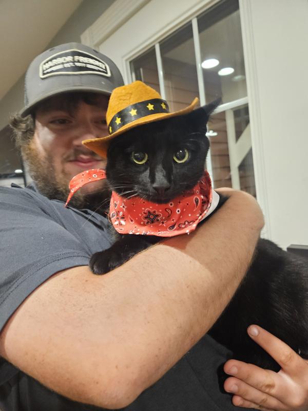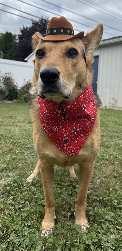 FOR PET USE ONLY. NOT SUITABLE FOR CHILDREN. This bandana is not for use with a tie-out, lead or as a restraining device. Intended to be used for a short duration and always under adult supervision. Always supervise your pet to ensure that they do not ingest the bandana or headwear. May be harmful if ingested. For your pet's safety, be sure the hat fits properly. DO NOT ALLOW THE HAT TO COVER YOUR PET'S EYES. Inspect regularly and replace if any part becomes damaged. Some color transfer may occur. Keep away from open flame.