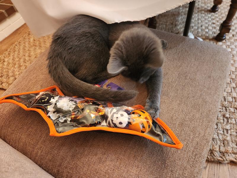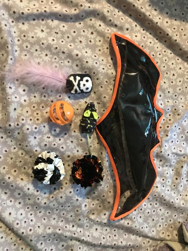 - - Includes 2 mylar balls, 1 rattle ball, 1 plush mouse, 1 plush skull