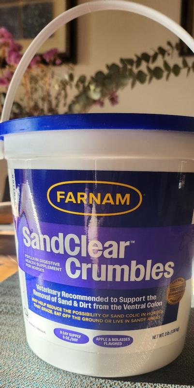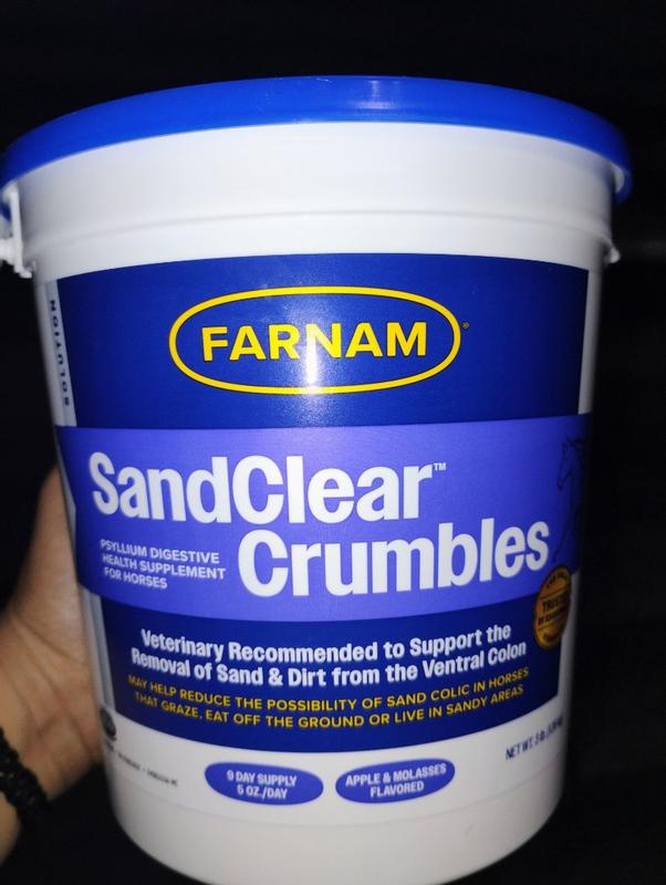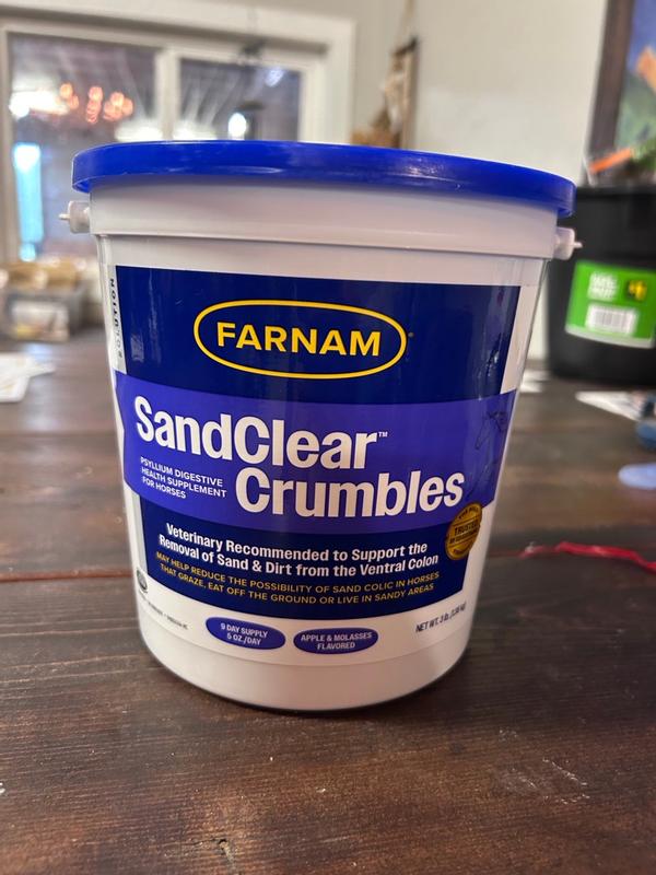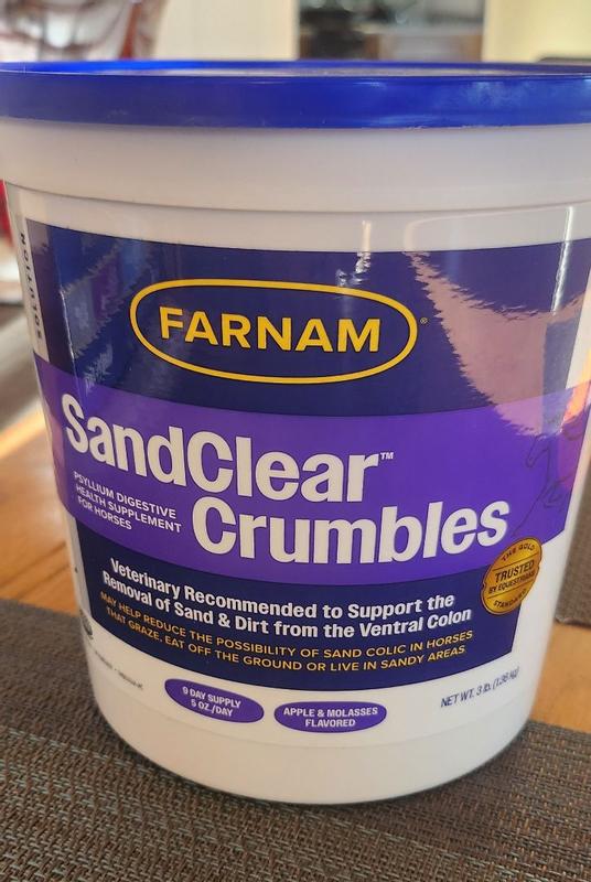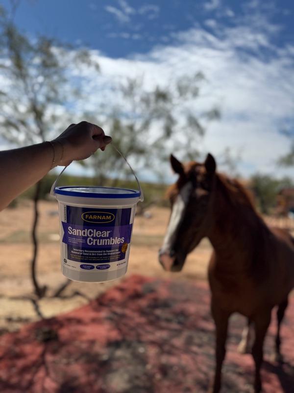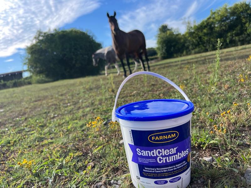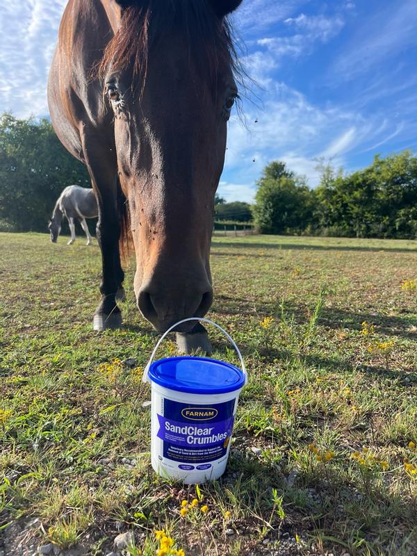 Sand impactions can occur when a horse ingests sand or soil particles accidentally or intentionally. The excess sand may congregate in the horse's intestinal tract and can obstruct your horse's colon. This condition-called sand colic-can be excruciating and dangerous for your horse. The incidence of sand colic is often limited to horses in sandy areas or regions, but horses can have bouts of sand colic regardless of where they live and even if they're grazing on pastures. Sand and dirt hide in unexpected places like hay bales, grass pastures, and your horse. Help protect your horse from sand colic with SandClear Natural Psyllium Crumbles. Sand Clear for horses contains a premium psyllium seed husk to support the removal of sand and dirt from the ventral colon. Ideal for horses that graze or eat off the ground, this supplementary dietary fiber is recommended by a veterinarian to help maintain a healthy digestive tract for horses of all ages, including foals.