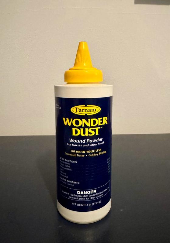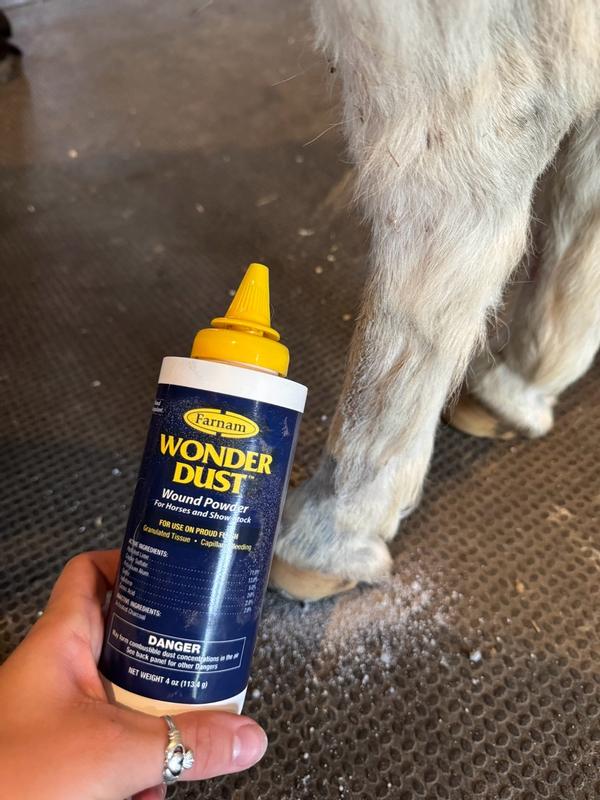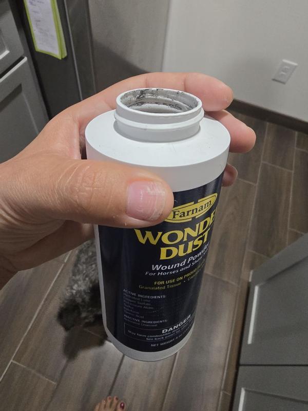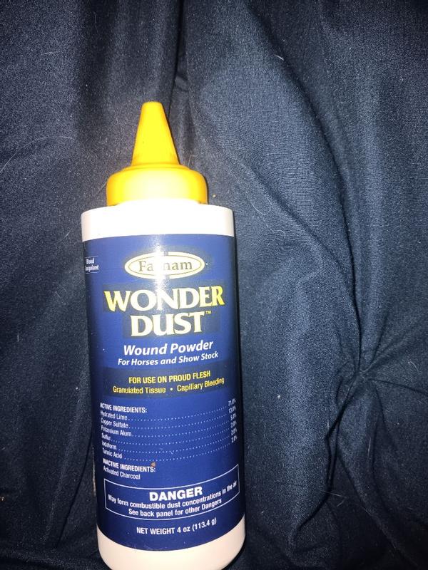 Put a quick end to bleeding with Wonder Dust Wound Powder. This winning formula stops bleeding fast & helps slow-healing sores and infected lesions dry up quickly. A Farnam classic product, Wonder Dust is a dressing powder and blood coagulant for use on wounds, cuts, abrasions and capillary bleeding. It works lighting quick and can be used with or without a bandage. Product is specially formulated for use on horses and show stock. It is a caustic and drying agent for slow healing sores, infected lesions. Wonder Dust contains activated charcoal which aids in the prevention of proud flesh. This product stops the bleeding fast, dries up wounds quickly and controls tissue granulations. Formula also has a deodorant to remove objectionable odors from foul or infected wounds. Shake well before using.Open nozzle by turning tip up. Hold nozzle 2 to 4 inches from wound. Squeeze container firmly,puffing powder freely over the entire surface of the wound. Repeat application as often as necessary.