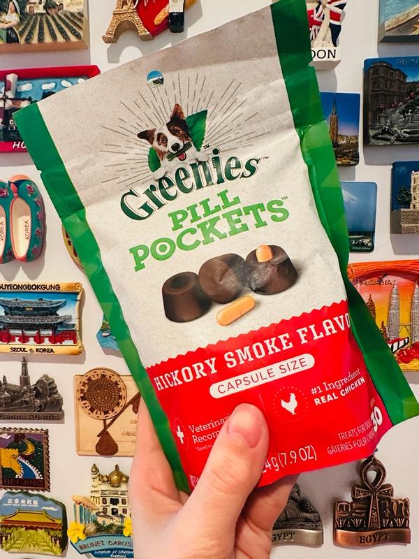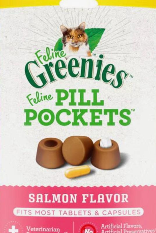 Take the stress out of giving your cat their medicine. FELINE GREENIES PILL POCKETS Treats for Cats easily hide most tablet-sized and capsule-sized pills in a great-tasting meaty treat that's made with natural ingredients plus minerals and trace nutrients. These soft cat treats are the #1 vet recommended choice for giving pills* and feature a delicious salmon flavor that helps disguise the taste of the medicine.