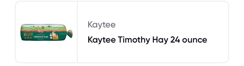 Provide Kaytee Timothy Hay in a feed hopper, bin or loose. The amount offered will vary with the size of the animal. Small animals benefit from Timothy Hay as a fiber source, chewing material to discourage hairballs, and as a nesting material. To complete the diet, feed Kaytee Forti-Diet or Fiesta daily in a separate container. Change food and fresh water daily.