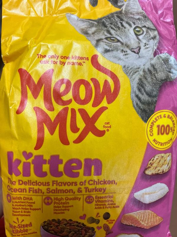 Introduce your kitten to taste that hits with Meow Mix Kitten Li'l Nibbles Kitten Food. This dry cat food recipe features the delicious flavors of chicken, ocean fish, salmon and turkey in bite-sized kibbles perfect for little mouths. It's also formulated with an optimal mix of protein, fat and carbohydrates to help sustain kitten energy, and all the essential nutrients to support healthy growth. That includes DHA, a nutrient found in mother cats' milk that helps support vision and brain development. Every bowl provides one hundred percent complete and balanced nutrition, with an irresistible taste kittens love. Once they try it, they're sure to understand why Meow Mix cat food is The Only One Cats Ask for by Name.