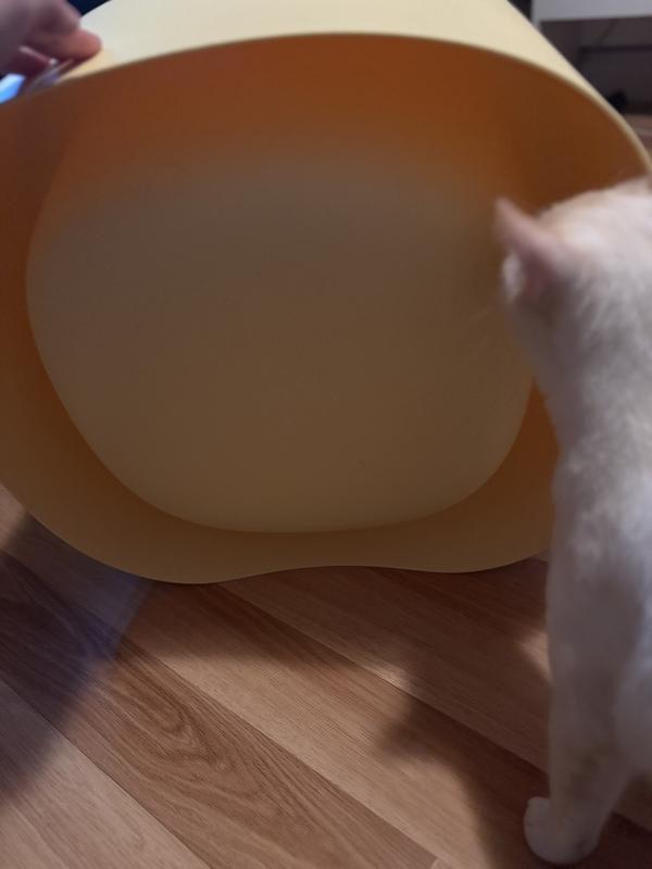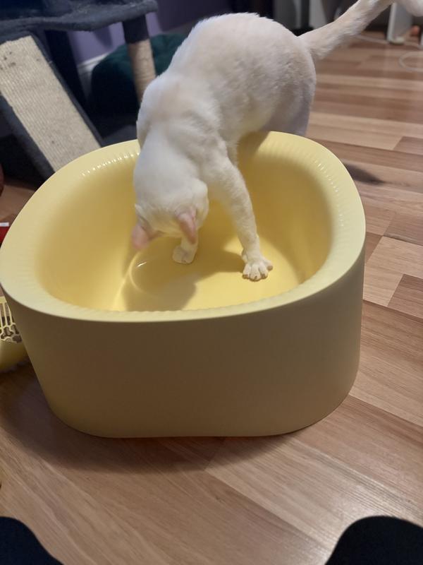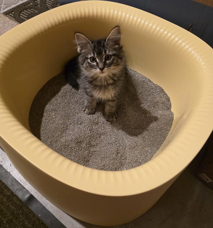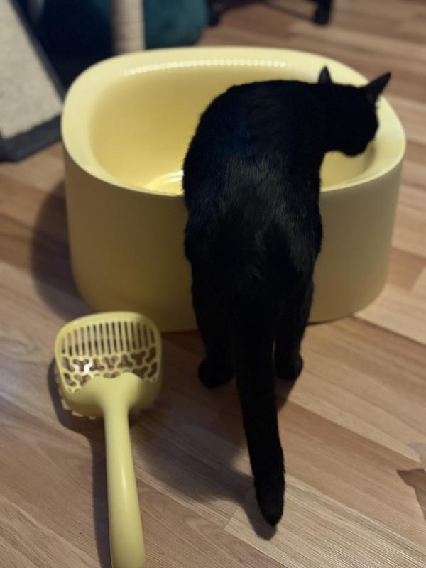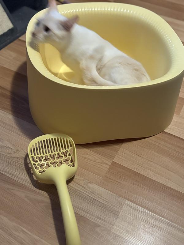 Place the litter box in a quiet, accessible area. Fill with 2-3 inches of your preferred litter. Scoop daily using the included litter scoop. Wash with mild soap and water as needed. Avoid harsh chemicals. If transitioning from a covered litter box, allow your cat time to adjust to the open design.