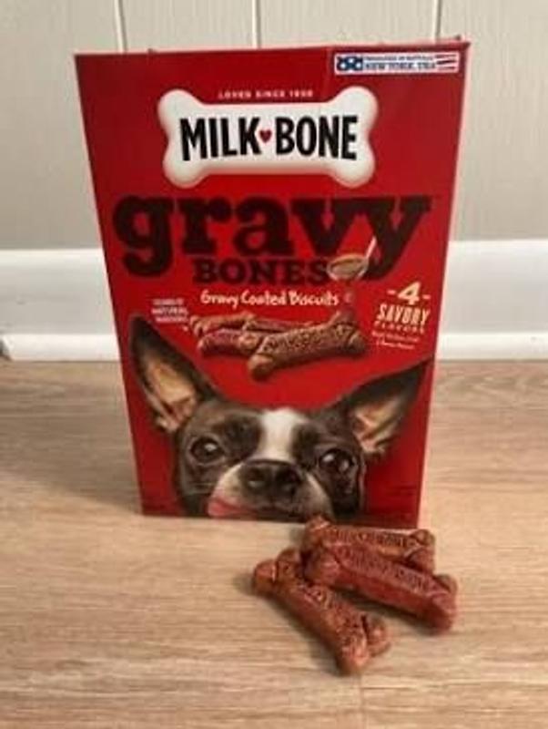 Milk-Bone GravyBones dog biscuits feature the same vitamin-fortified goodness of Milk-Bone Original dog snacks in 4 delicious, gravy-basted varieties your dog will love: beef, chicken, bacon and liver flavors. These tasty dog treats are prepared with care in Buffalo, New York, USA, using only natural ingredients as sources of color. Better yet, the crunchy texture of Milk-Bone dog biscuits helps freshen dogs? breath and reduce tartar build-up. So you can not only feel good about the wholesome goodness you?re giving your doggo; you can also fully enjoy all the grateful, sloppy kisses that are sure to come your way. Win-win.