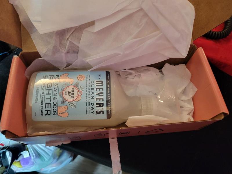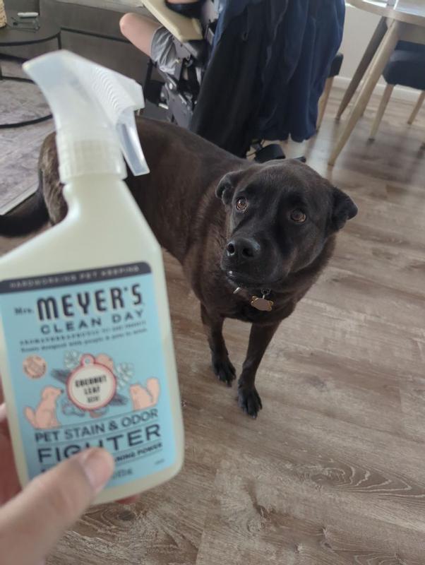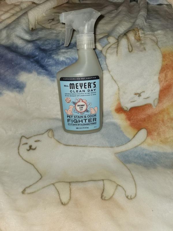 Mrs. Meyer's Clean Day for your pets. Our new Stain & Odor Fighter is tough on pet messes and accidents but friendly on whiskers and paws. With scents designed with people and pets in mind, this hardworking product fights pet stains and odors for up to 7 days with the power of probiotics for all your soft surfaces-from carpets, rugs and couches to bedding, upholstery, and clothing. Because everybody (especially our pets!) oops sometimes.