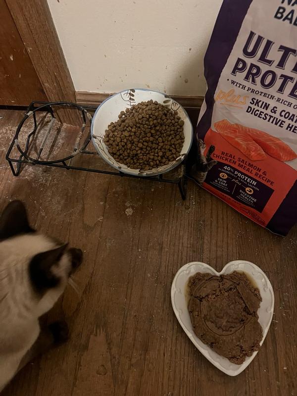 Natural Balance Ultra Protein Real Salmon & Chicken Meal Recipe is formulated specifically for cats with our veterinary and nutrition experts to maximize protein, taste and nutrition for even the pickiest eaters. This delicious recipe A is made with protein-rich organs and is enhanced with added vitamins & minerals to give your cat the energy & additional health support that they need. A Skin & Coat Health is supported by key nutrients Omega 3 & 6 Fatty Acids plus Vitamin E to provide a superior Skin & Coat cat food. Digestive Health is supported from pre & probiotics and easy-to-digest, fiber-rich ingredients as well as highly digestible protein for a digestive health cat food.
