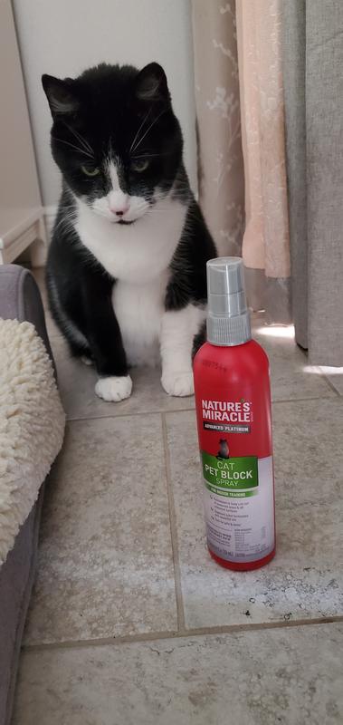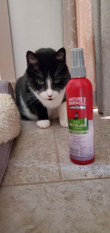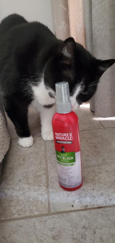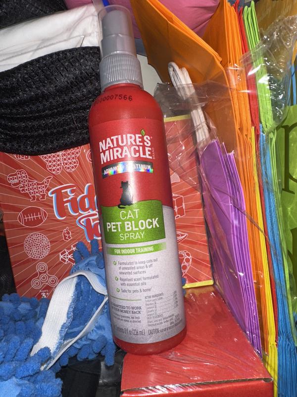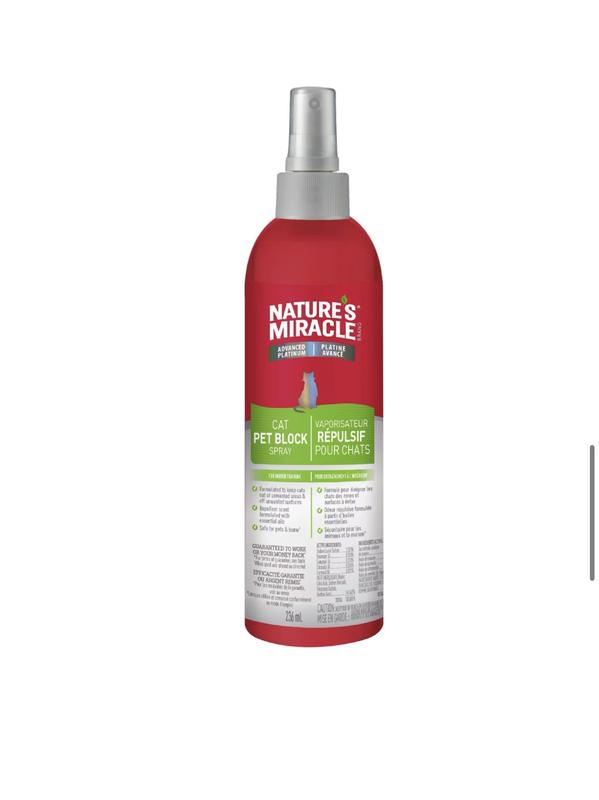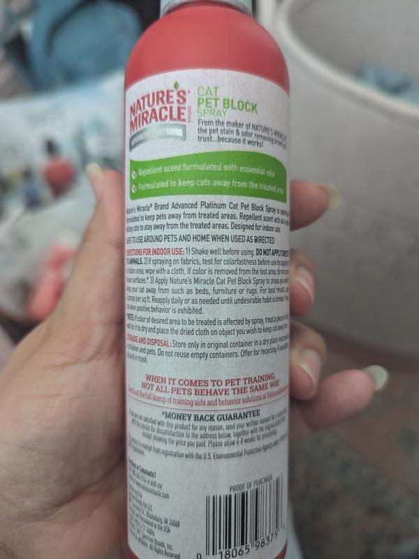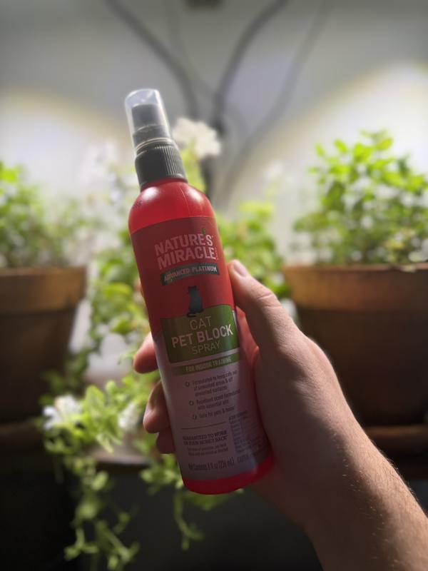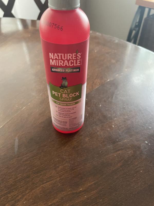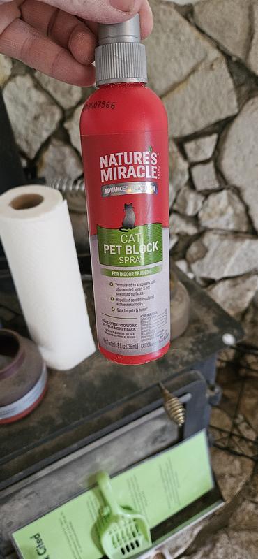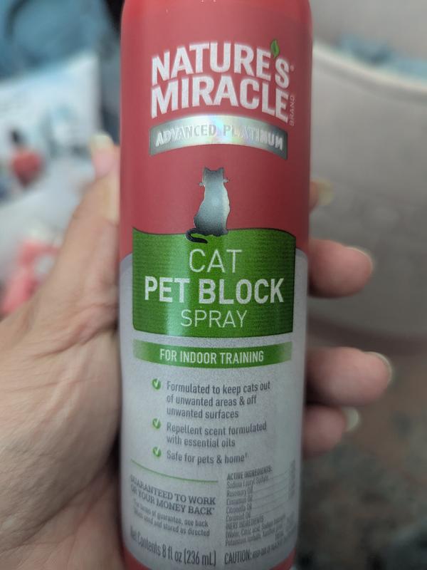 Nature's Miracle pet stain and odor removers have been a trusted brand for pet mess cleanup for 40 years. Whatever pets do, you can trust Nature's Miracle products to undo. Sometimes your cat needs a little help in the training department. Nature's Miracle Advanced Platinum Cat Pet Block Repellent Spray is formulated to keep cats away from treated areas. Designed for indoor training, the formula contains fragrance made with essential oils. Repellent scent acts as a signal telling cats to stay away from the treated areas. Safe for pets and home when used as directed. To use indoors, spray the areas you wish to keep your cat away from, such as beds, furniture or rugs. Reapply daily or as needed until the undesirable habit is broken. Be sure to praise your pet for positive behavior! Not for use directly on pets.