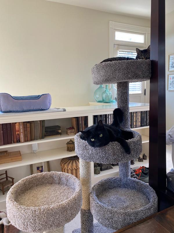 This cat tree contains three perches all of which are round cat beds measuring a spacious 16 inches amd also features a huge sisal rope scratching post, three large carpeted scratching posts, and three round cat beds with small lips on them for safe and easy access for your family pet. This is a sturdy well built cat tower that will provide your feline friends with lounging areas and scratching areas to keep them well rested and healthy. This cat condo is made with quality materials here in the USA.