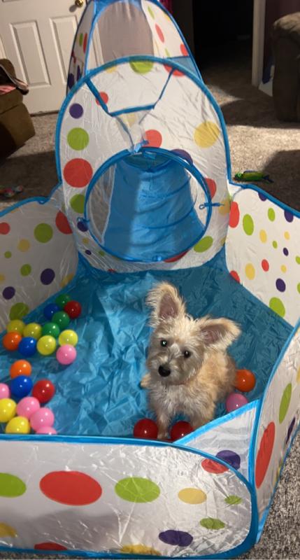 Treat your pet to a day of play with the Piggy Poo and Crew Play Tunnel & Pop Up Tent. This set includes a play tent or ball pit, a tunnel, and 50 colorful soft plastic ball pit toys--everything you need to keep your pet entertained and happy. Try adding treats in the ball pit for a super-fun scavenger hunt! This easy-to-clean set can be used indoors or outdoors and comes with a convenient storage bag. Suitable for indoor or outdoor use. Can help with behavior training. Perfect for daily use to keep your pet entertained.