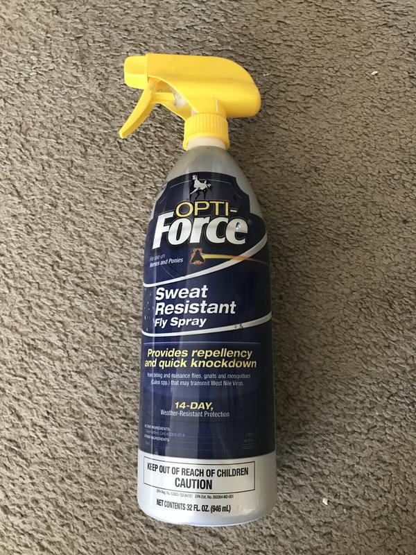 Manna Pro Opti-Force Fly Spray is a sweat- and weather-resistant fly repellent for horses. Opti-Force Provides repellency and quick knockdown from horse flies, house flies, stable flies, face flies, horn flies, deer flies, gnats and mosquitoes (Culex spp.) that may transmit West Nile Virus. It lasts for 14 days, even when your horse sweats or after rainfall. This ready-to-use formula requires no mixing and can be used on horses and ponies.