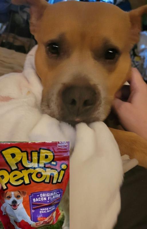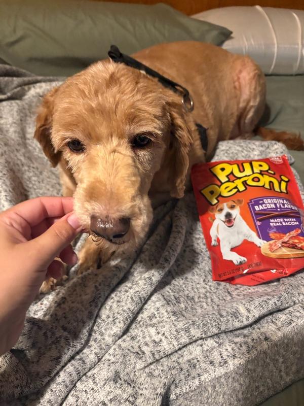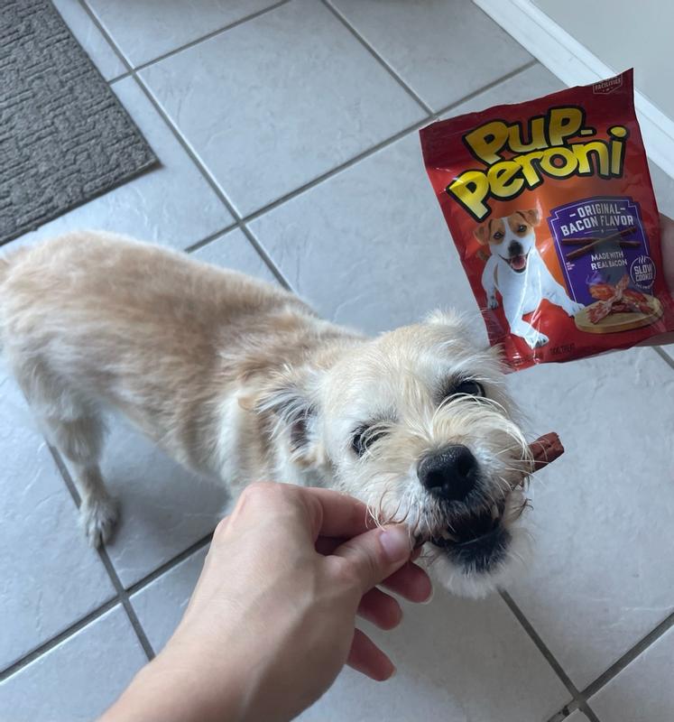 Bacon flavor dog snacks? Heck yes. Pup-Peroni Original Bacon Flavor dog treats are a tasty way to make your dog's day. The number one ingredient is real beef, so they get delicious, high-quality protein in every bite. And in case that's not enough to get your dog pumped - Pup-Peroni slow cooks each treat for at least 2.5 hours, which helps retain moisture and intensifies the taste and aroma. The result? An irresistibly rich, meaty treat with a soft, tender texture dogs can sink their teeth into. It's everything your dog wants in a treat and yet, nothing you don't. No fillers. No Red 40. Just the crazy-good soft dog treats your pup craves.