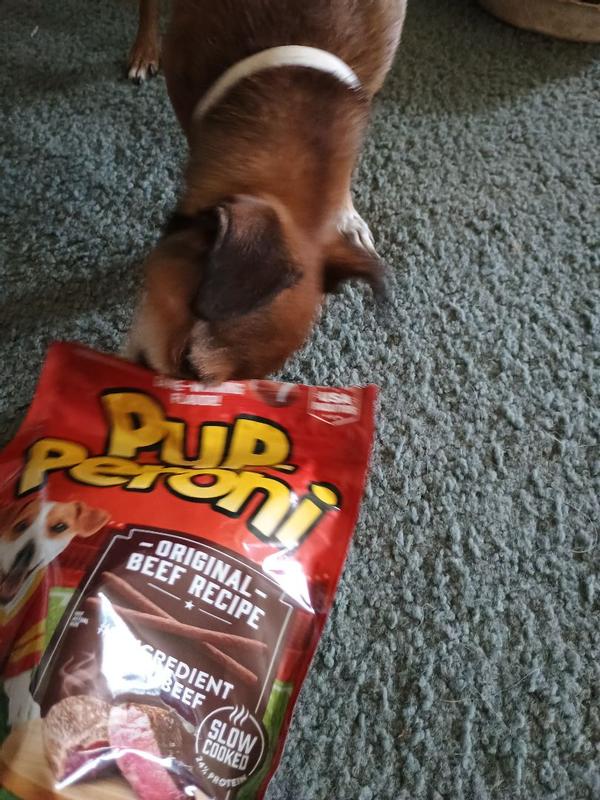 Treat your dog to the big beefy taste and mouthwatering aroma of Pup-Peroni Original Beef Recipe dog snacks! Real beef is the number one ingredient, so your dog gets delicious, high-quality protein in every bite. And in case that's not enough to get your pup pumped - each treat is slow cooked for at least 2.5 hours. The brand's slow cooking process helps retain moisture and intensifies the taste and aroma. The result is an irresistibly rich, meaty treat with a soft, tender texture dogs can sink their teeth into. It's everything your dog wants in a treat and yet, nothing you don't. No fillers. No Red 40. Just the crazy-good soft dog treats your dog craves. Pick up a bag today!