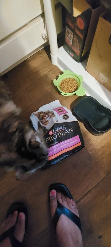 Give your cat the gentle nutrition they need with Purina Pro Plan Stomach Sensitive Cat Food. Specially formulated for digestive health, this dry cat food features real salmon as the first ingredient, offering a delicious and high-quality protein source. The easily digestible cat kibble is enriched with prebiotic fiber, supporting cat digestive support and a balanced gut microbiome. Designed for sensitive stomach cat food needs, this formula also nourishes skin with omega fatty acids and vitamin A, promoting a healthy coat. Each serving of Purina Pro Plan for cats provides essential nutrients for overall well-being, making it an excellent choice for daily feeding. This sensitive stomach dry cat food promotes immune and digestive health. Choose Purina Pro Plan sensitive skin and stomach cat food to support your feline's comfort and vitality with every meal.
