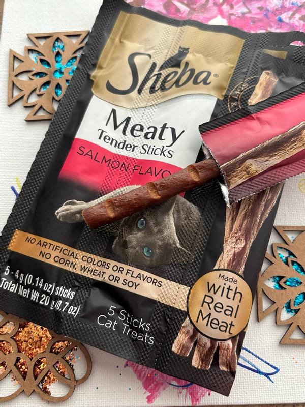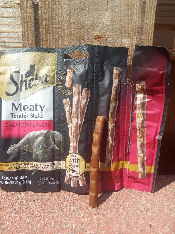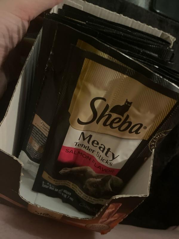 - - 10-Pack: Contains fifty (50) 0.14 oz. Sheba Meaty Tender Sticks Salmon Flavor