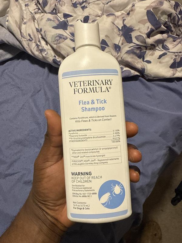 - - Rid your pet of fleas and ticks instantly with Veterinary Formula Clinical Care Flea and Tick Shampoo. Enriched with Pyrethrum, a natural insecticide, to kill flea and ticks on contact. Aloe Vera and Lanolin help soothe bites, while the paraben and soap-free formula gently cleanses to restore luster. Follow label directions carefully for optimal results