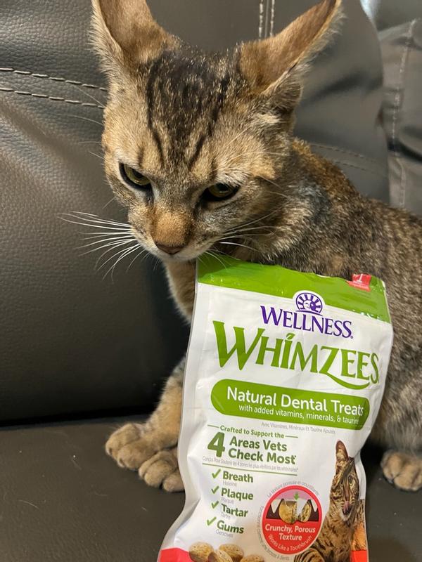 You brush daily, your cat should too! Wellness WHIMZEES cat treats are designed to act like a toothbrush to help support the four areas vets check most - breath, plaque, tartar, and gums - all while they chew. Our scientifically crafted treats are complete & balanced for adult cats and taste great!