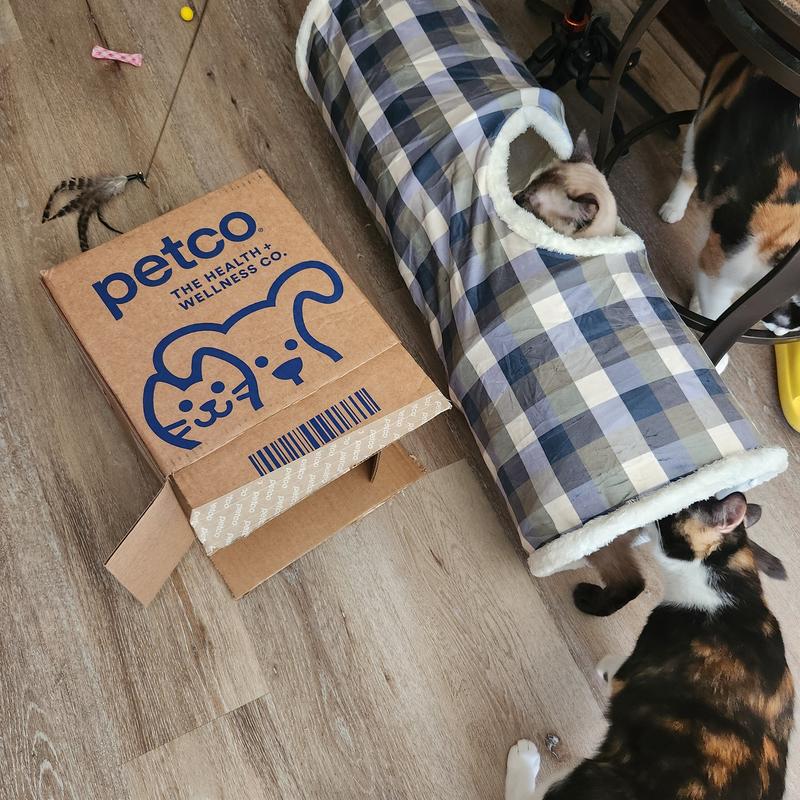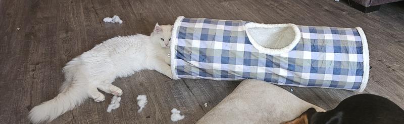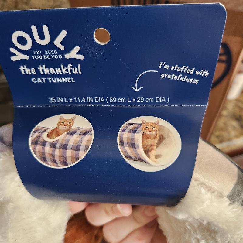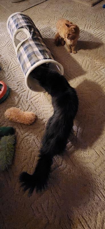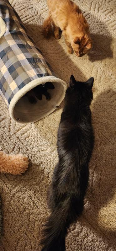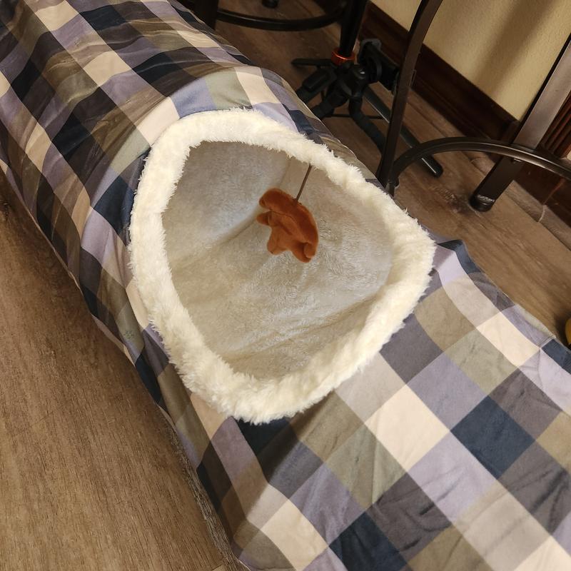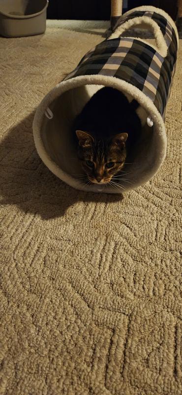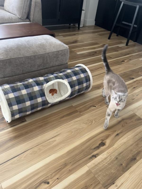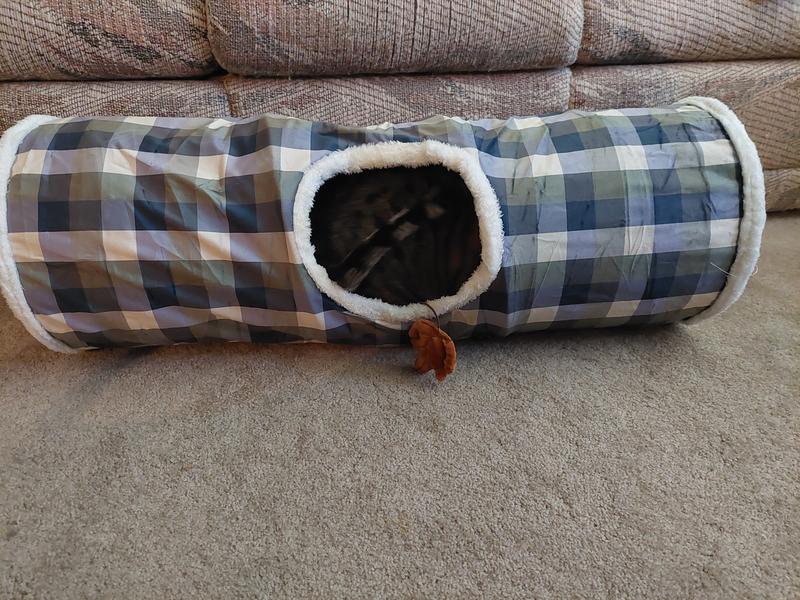 Get lost in the fun of this Youly plaid cat tunnel that'll remind you of your favorite comfy flannel. This cozy hideaway is clad in a fall-inspired plaid pattern and features crinkly fun and a dangling catnip toy, giving you plenty of ways to play, prance, pounce, and more!