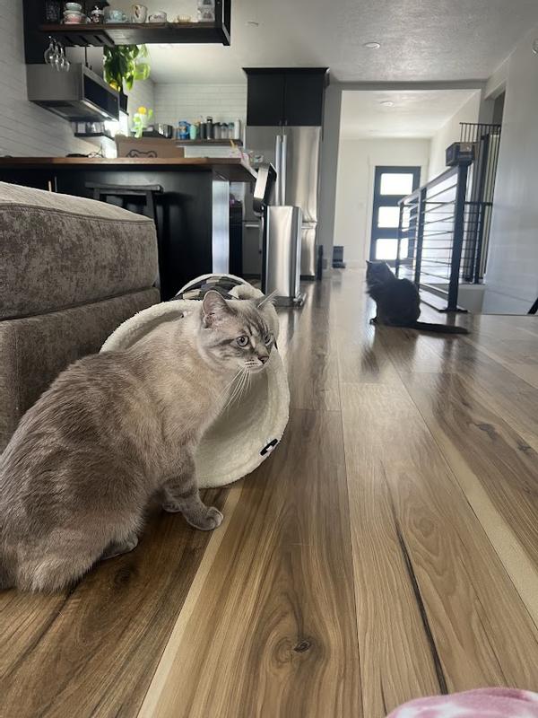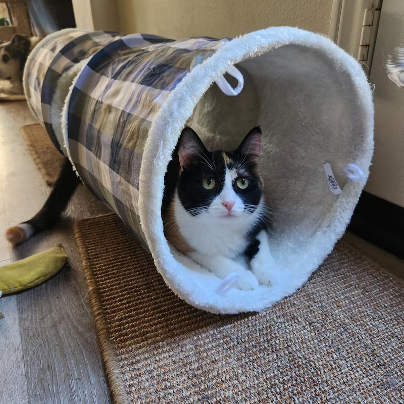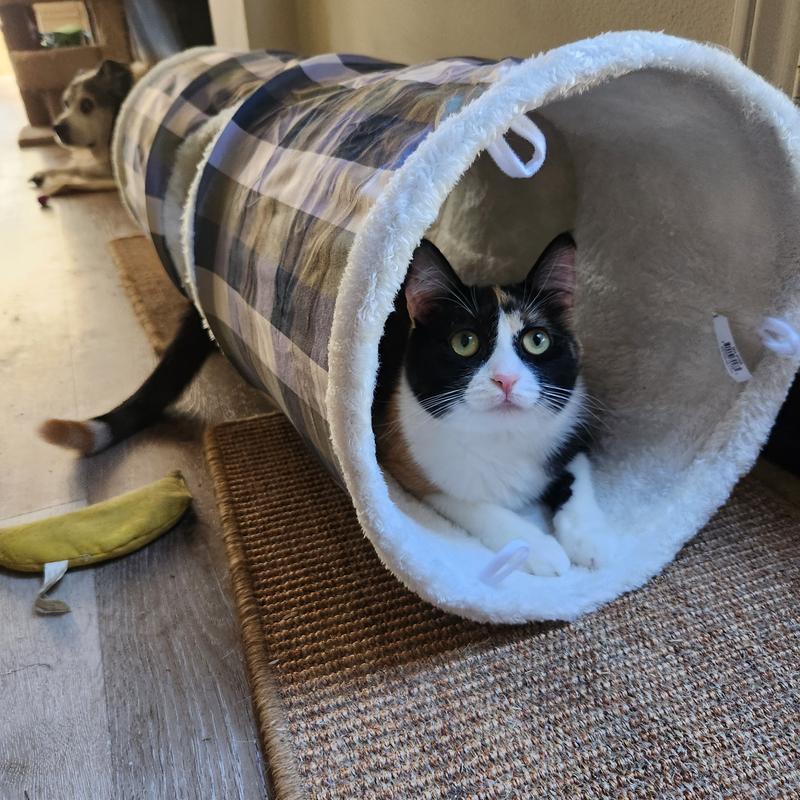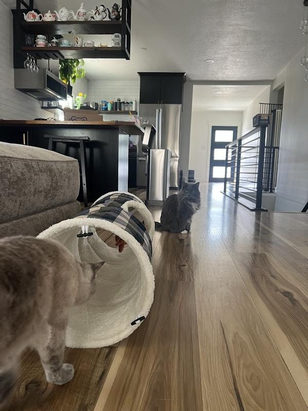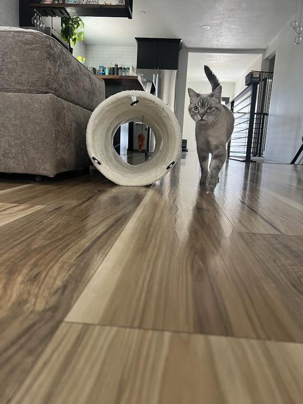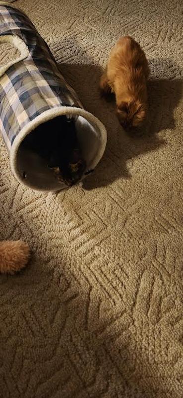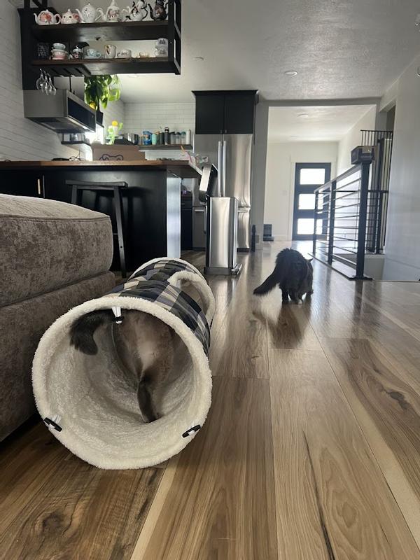 Get lost in the fun of this Youly plaid cat tunnel that'll remind you of your favorite comfy flannel. This cozy hideaway is clad in a fall-inspired plaid pattern and features crinkly fun and a dangling catnip toy, giving you plenty of ways to play, prance, pounce, and more!