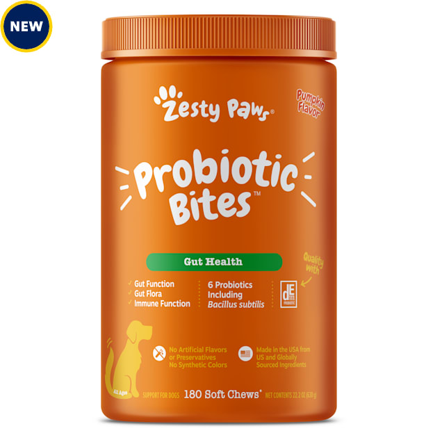 It's only natural that chowing down should be a fun part of your doggie's day. That's why pet parents like you want to aid your dog's wellness and digestive health to keep their stomach feeling Zesty! But... don't be upset! Instead, stop and rest easy because Zesty Paws is here to give pet parents like you a boost with Probiotic Bites, a soft chew supplement that will help you care for Fido's tummy. Each amazing chewable is made with six strains of probiotics (including DE111, a clinically studied Bacillus subtilis probiotic) to support gut health and immunity for canine pets. You'll enjoy the daily relief of giving your pup a great product for their gut and immune function. Plus, let's just say that we know your dog is ""anti-bad flavors."" So best of all, your dog will feel spoiled with special treatment thanks to Probiotic Bites' good taste that hits the spot instead of being stuck with not-so tasty pills, powder, capsules, or tablets. Well, that's sure worth wagging a tail about!